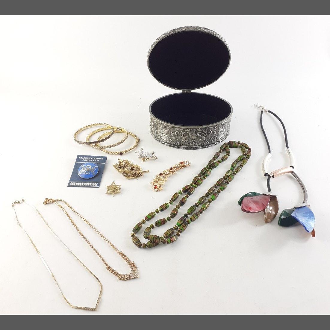 A heavyweight oval metal jewellery box containing enamelled brooches, bangles etc