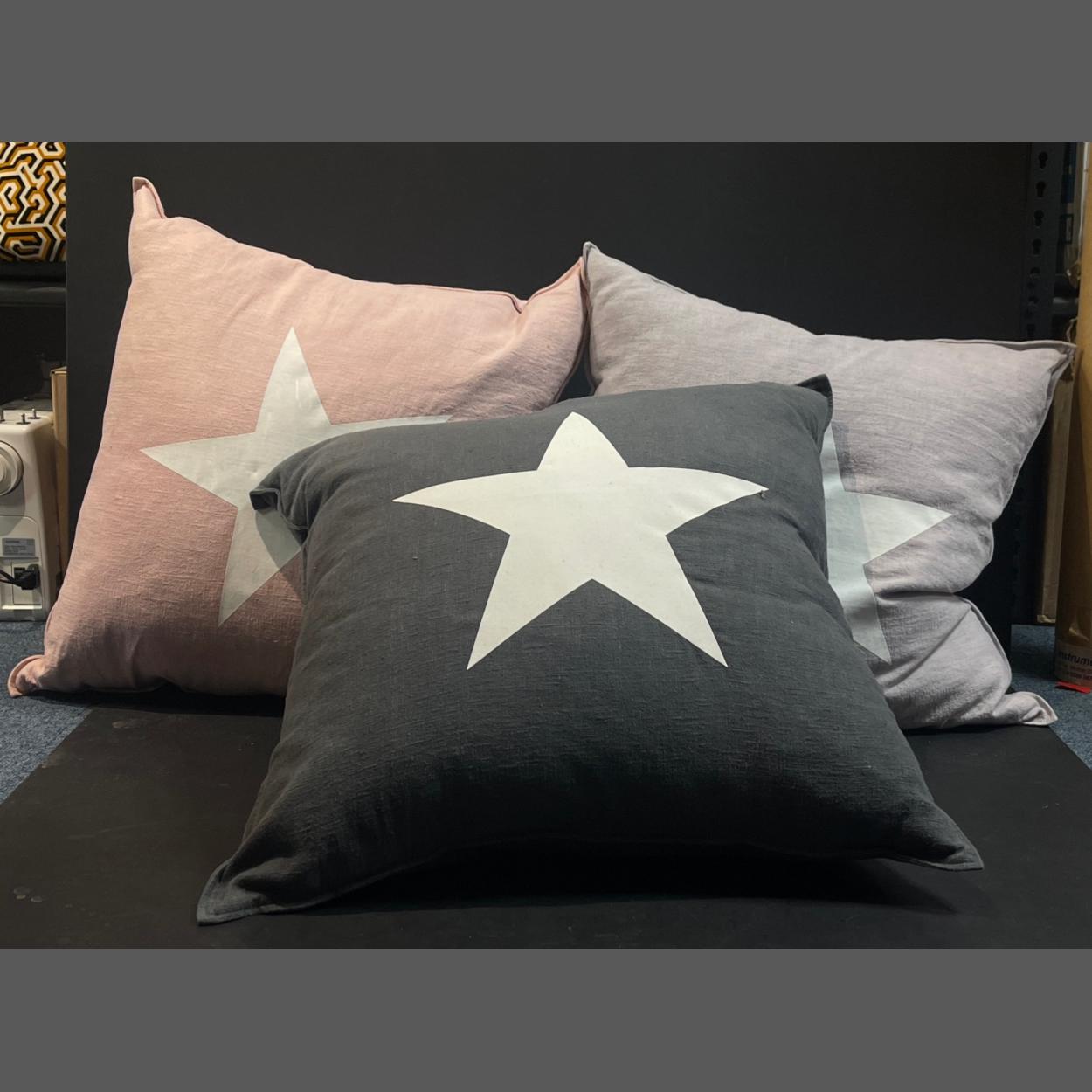 THREE SUPERLARGE STAR pattern cushions - one greyish/lavender, one in pink and in grey - pillows dimensions 50cm diameter approx square - rrp each £75