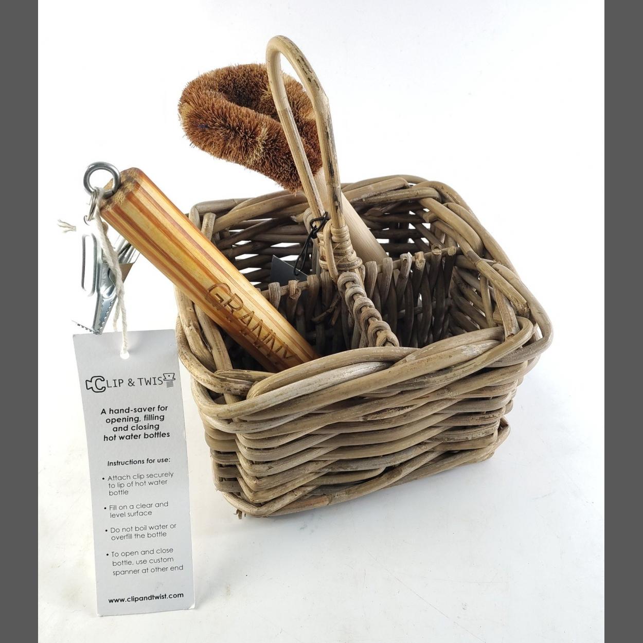 XMAS GIFTING IDEAS! - A HANDMADE wicker basket with an eco-friendly pot washer, a hot water bottle opener - rrp £50