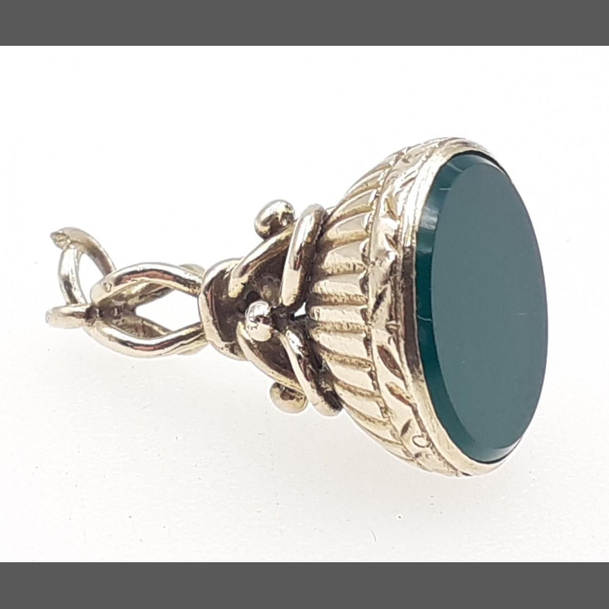 A fully hallmarked beautiful 9ct gold fob with inset green stone. 13mm diameter. Gross weight 5g approx