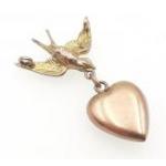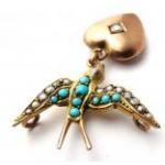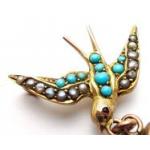 An emotive small jewel. A Swallow inset with torquoise stones delivering a love heart inset with pearl. 9ct stamped to wing. 3cm approx. Gross weight 2g approx.