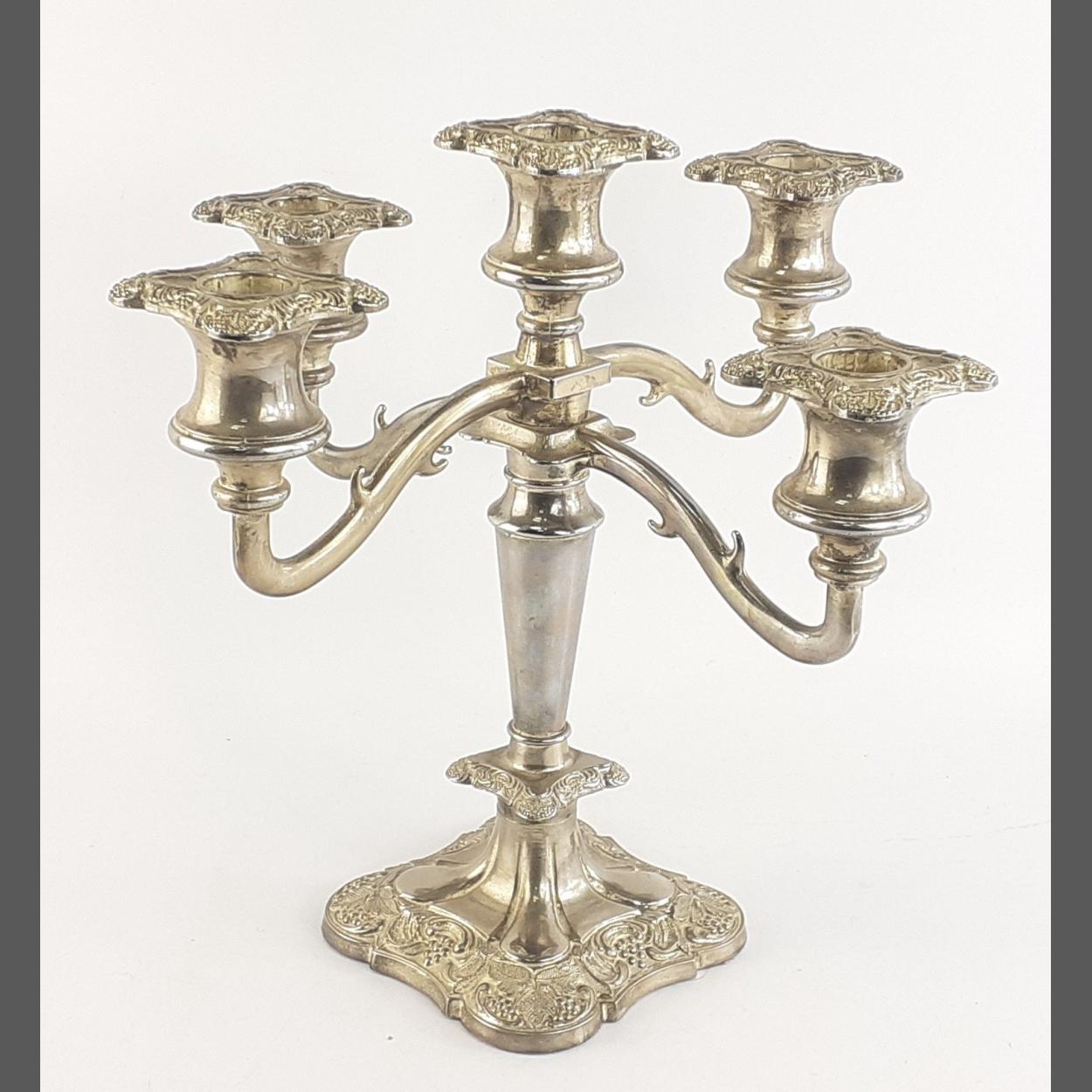 An impressive silver plated five holder four branch silver plated very heavy ornate candelabra. Stands 26cm tall approx. A very attractive centre piece.