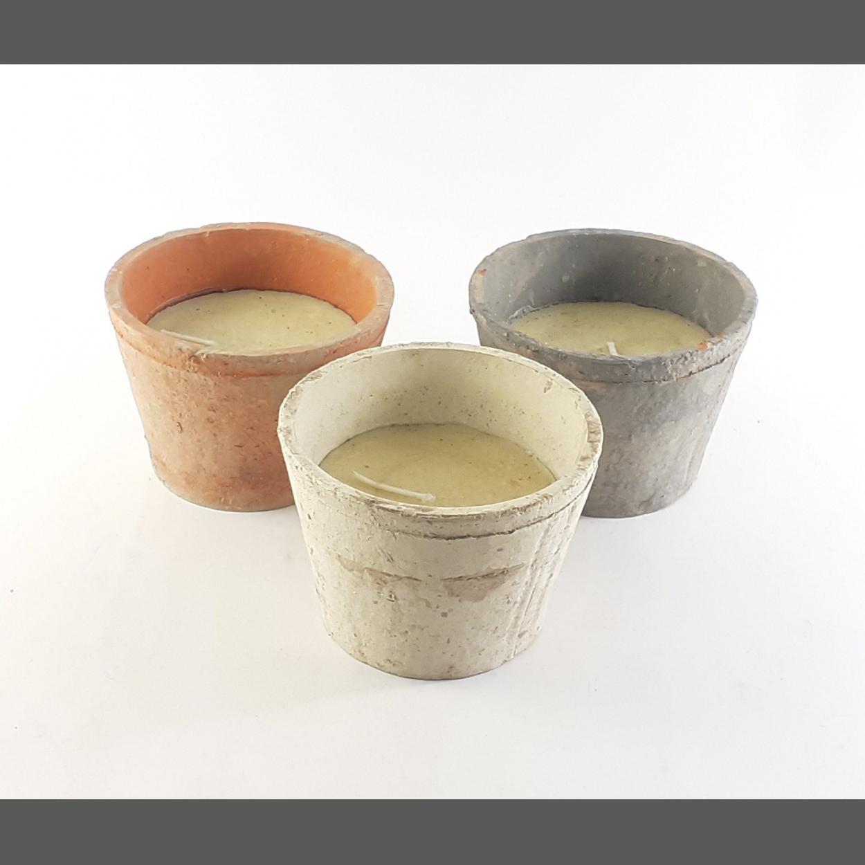 XMAS GIFTING IDEAS! - A set of 3 distressed clay pot shaped candles. Coloured white, grey and terracotta. RRP £75