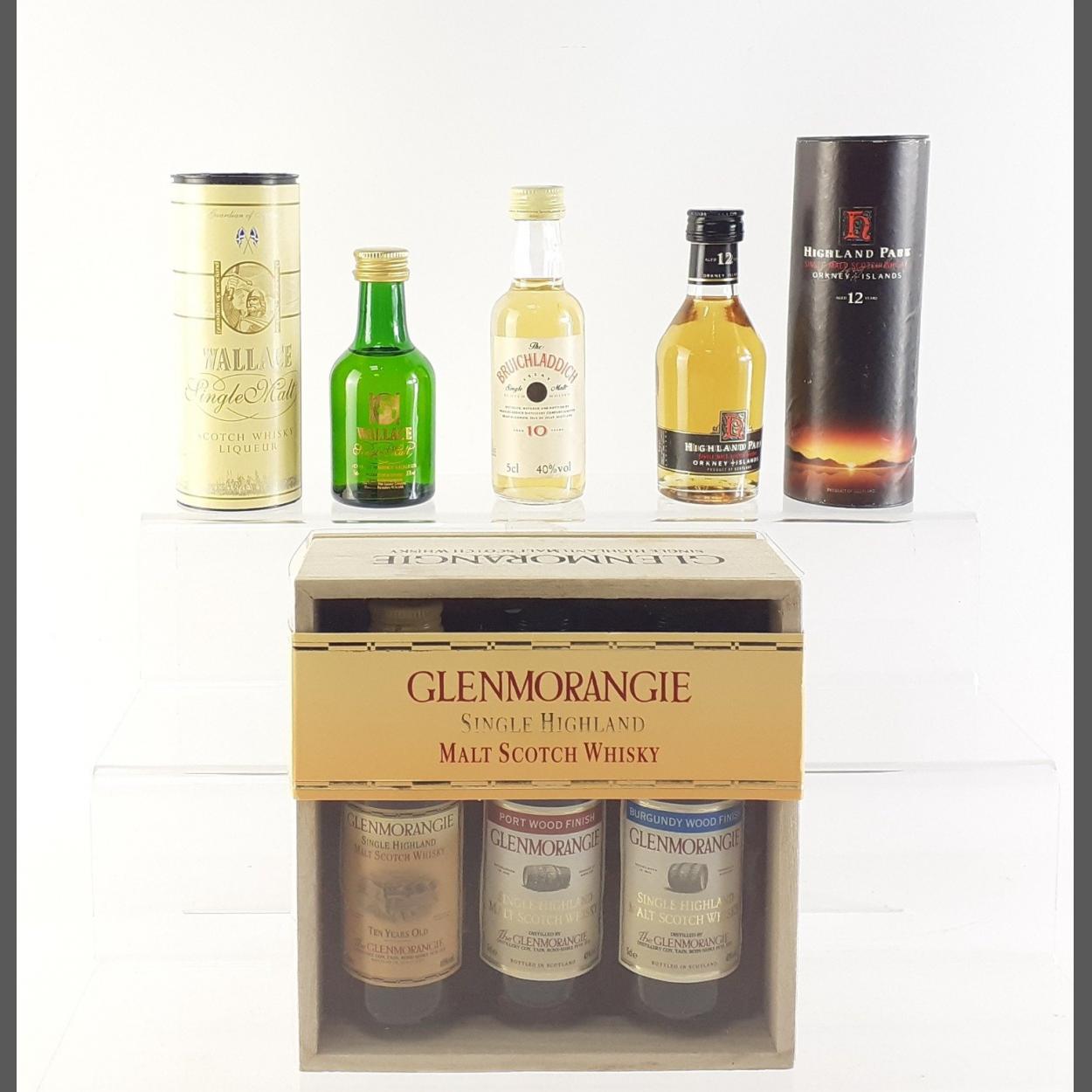 MINIATURES. A super wee selection of three GLENMORANGIE Malts, a Bruichladdich, Highland Park and an unusual Wallace liqueur.