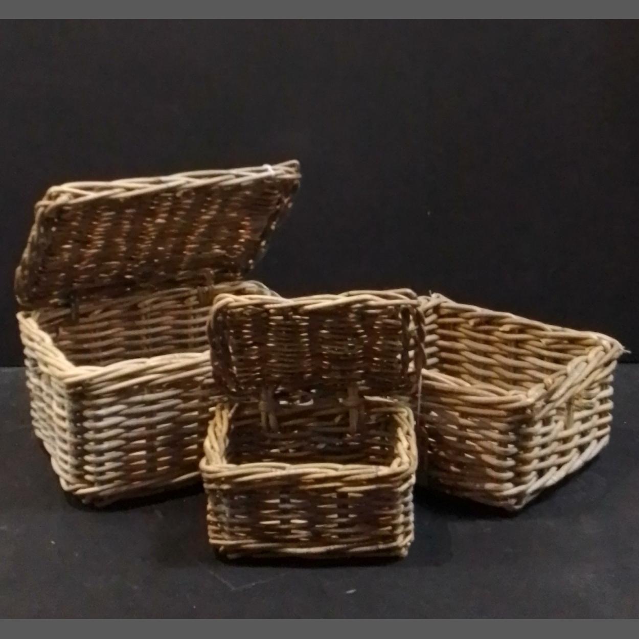 Three cane baskets, two lidded. The largest 30 x 22 cm x 19cm approx. MRP £60