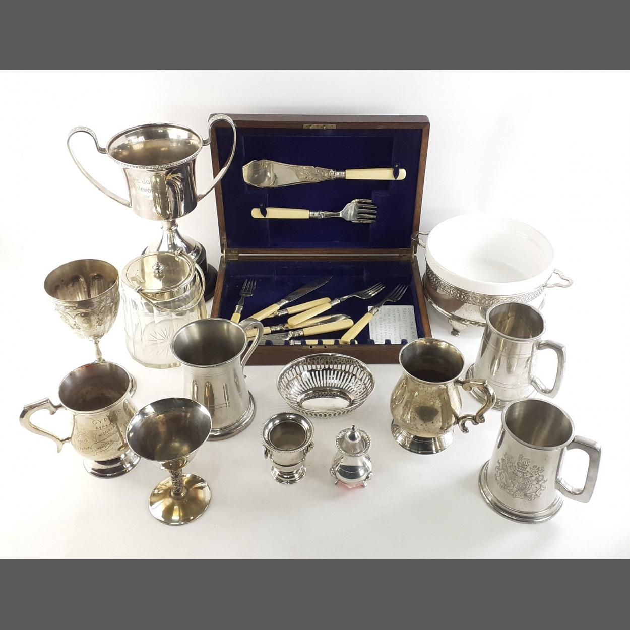 A mixed lot of silver plated items to include 2 goblets, 5 tankards, presentation trophy, canteen of fish knives and forks, condiments, etc