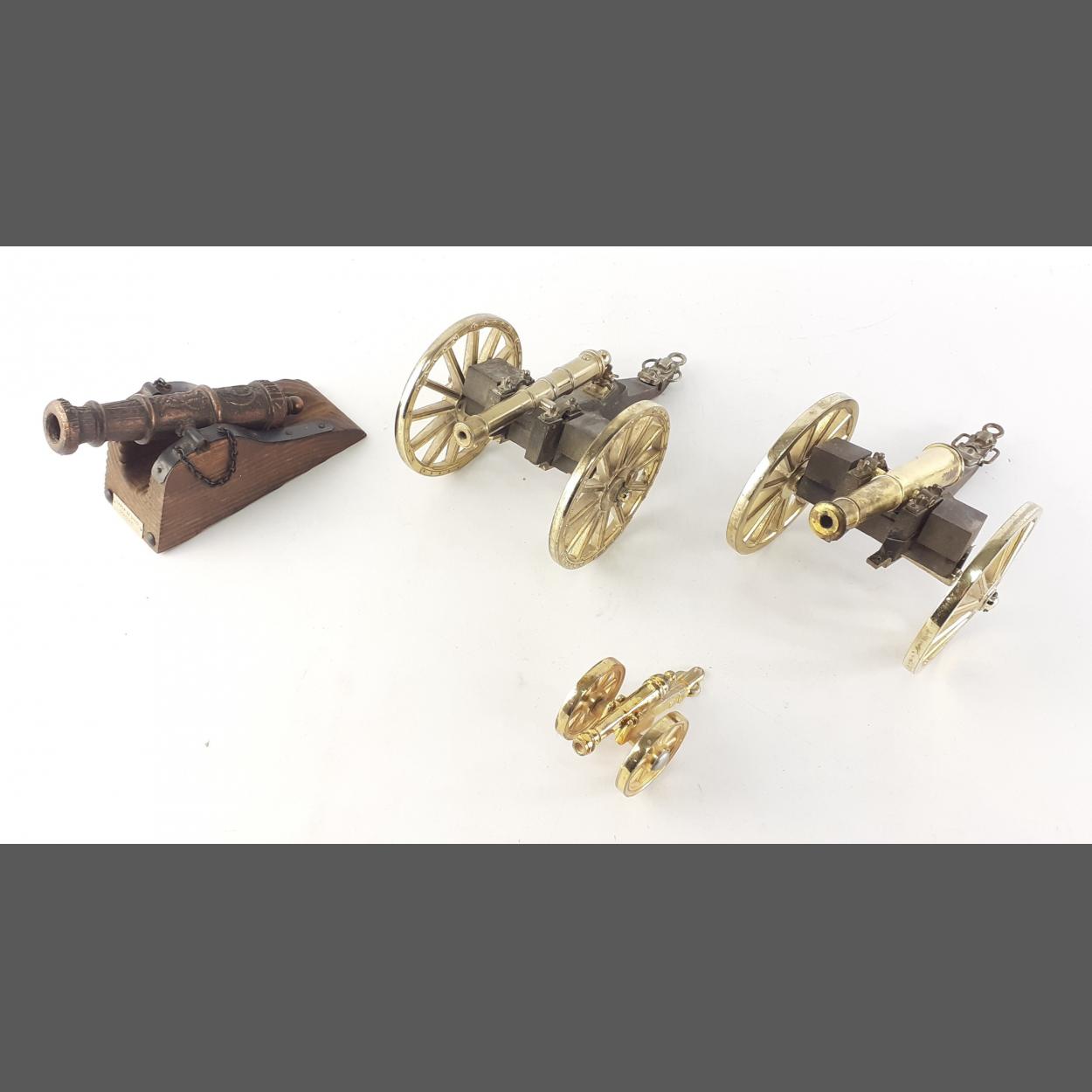 A collection of 4 model cannons largest measuring 20cm long 10cm wide and 10cm tall approx.