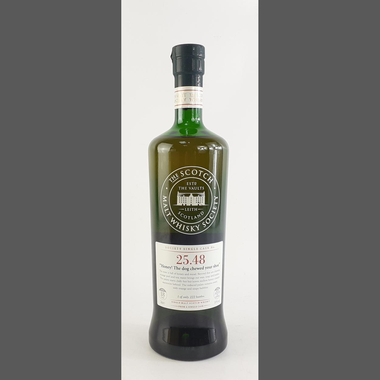 SMWS 18 years aged in the cask ROSEBANK 45.17 November 1990 THE SCOTCH MALT WHISKY SOCIETY. Society Cask No. 25.48 70cl - 'Honey The Dog chewed Your Shoe' - bottled in January 2009 - bottle and label in very good condition - a very good example of this bottle. 1 of only 222 bottles!