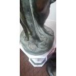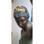 AMAZING ArtDeco style Figural Newel Post Neoclassical / Goddess bronze floor lamp with the left hand raised. Statue stands total height is196cm approx. - there is an electric light fitting in situ, but missing its glass flame shade. (One of a pair with lot 488)