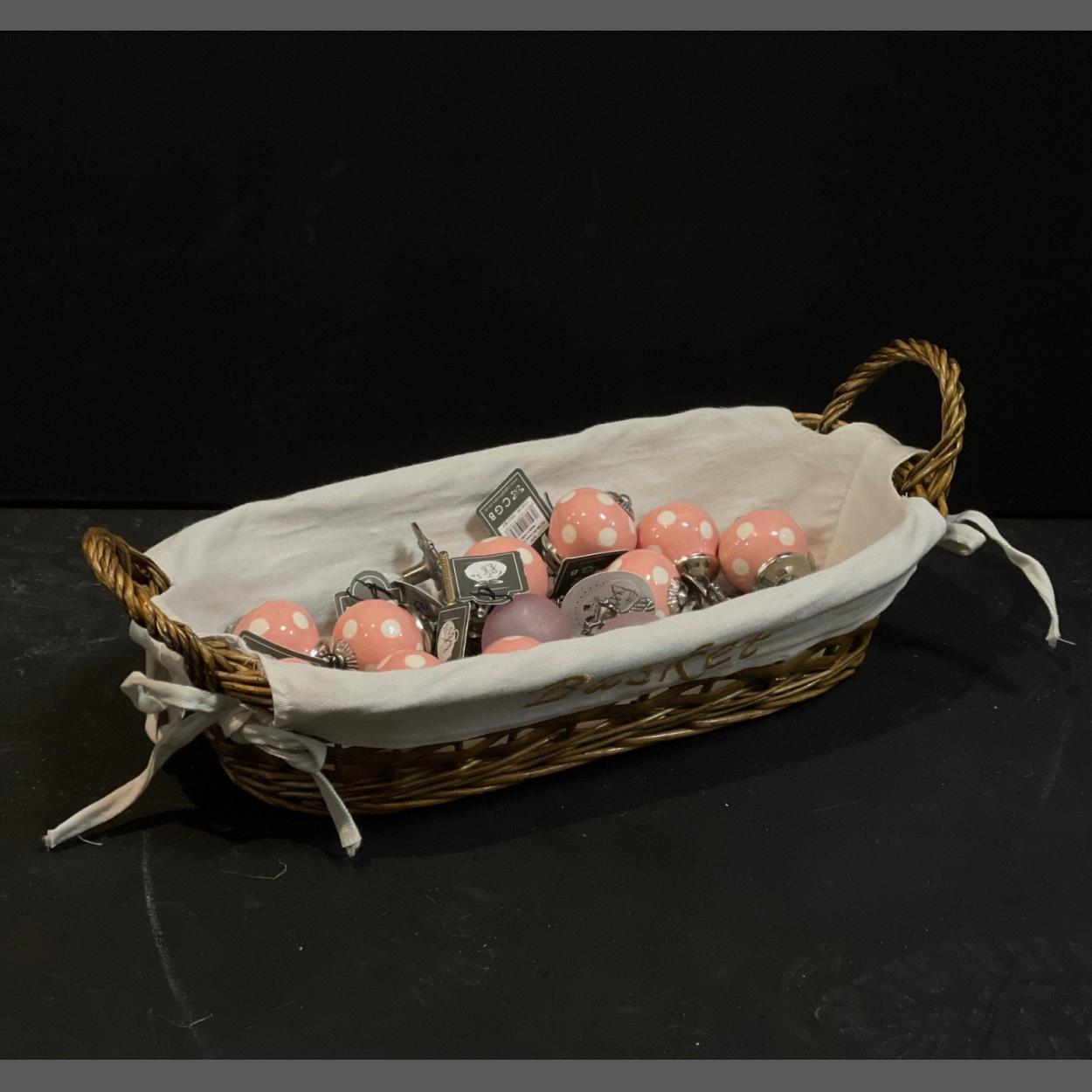 XMAS GIFTING IDEAS! - A handmade lined oval wicker basket to include 'multiple drawer pulls in glass and ceramic - diameter 5cm approx - over 15 drawer pulls - rrp approx £40