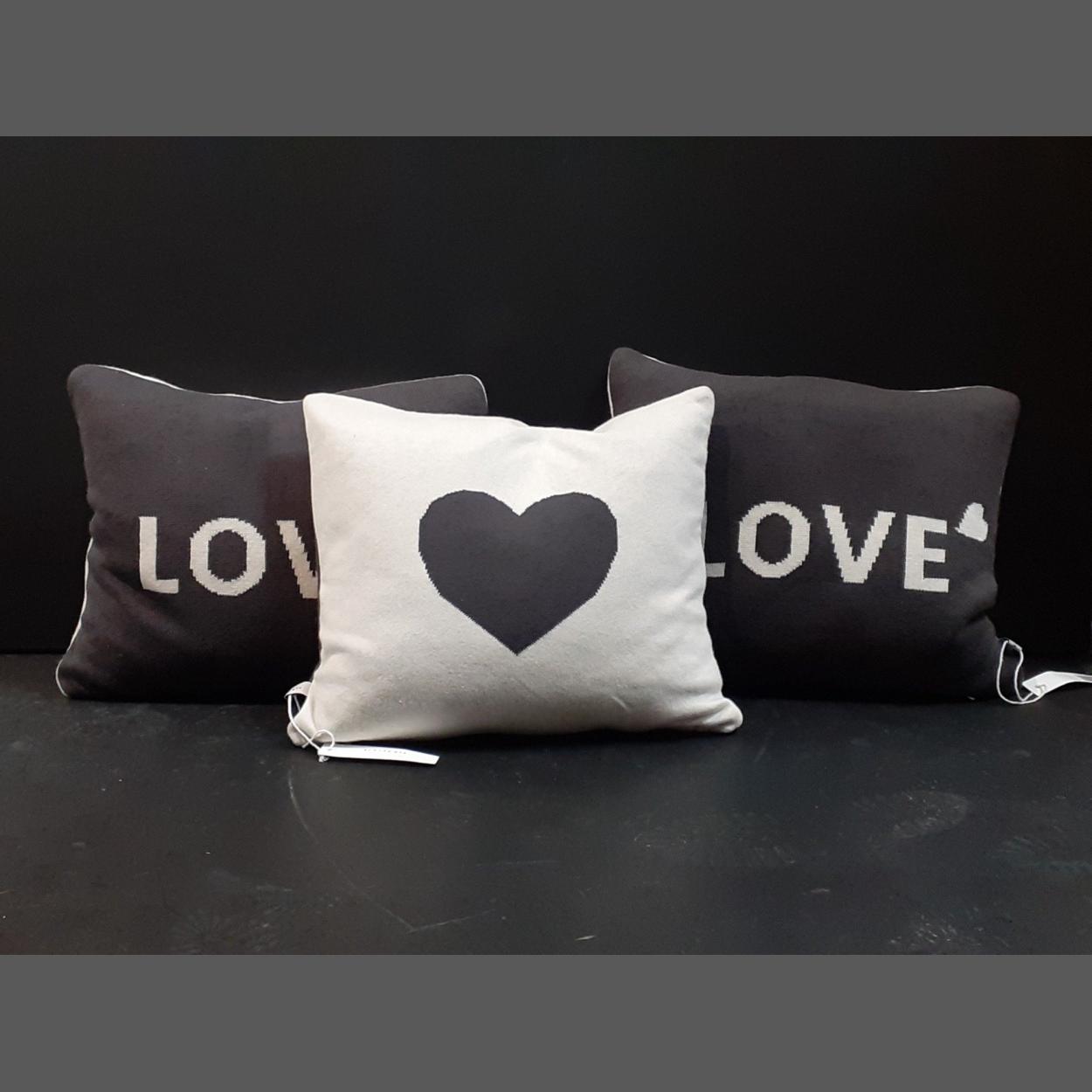 XMAS GIFTING IDEAS! - A set of three POSH handmade cushions by RETREAT featuring LOVE & LOVE HEARTS - darker grey and white - dimensions of each 38cm x 28cm approx - rrp each cushion £24.99