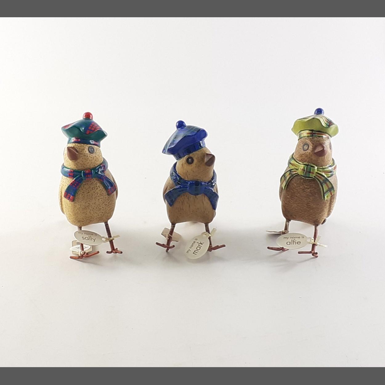 XMAS GIFTING IDEAS! - A trio of DCUK brand wooden robins MARK, ALFIE and SALLY in tartan bonnets. 15cm in height. Brand new RRP £26 each