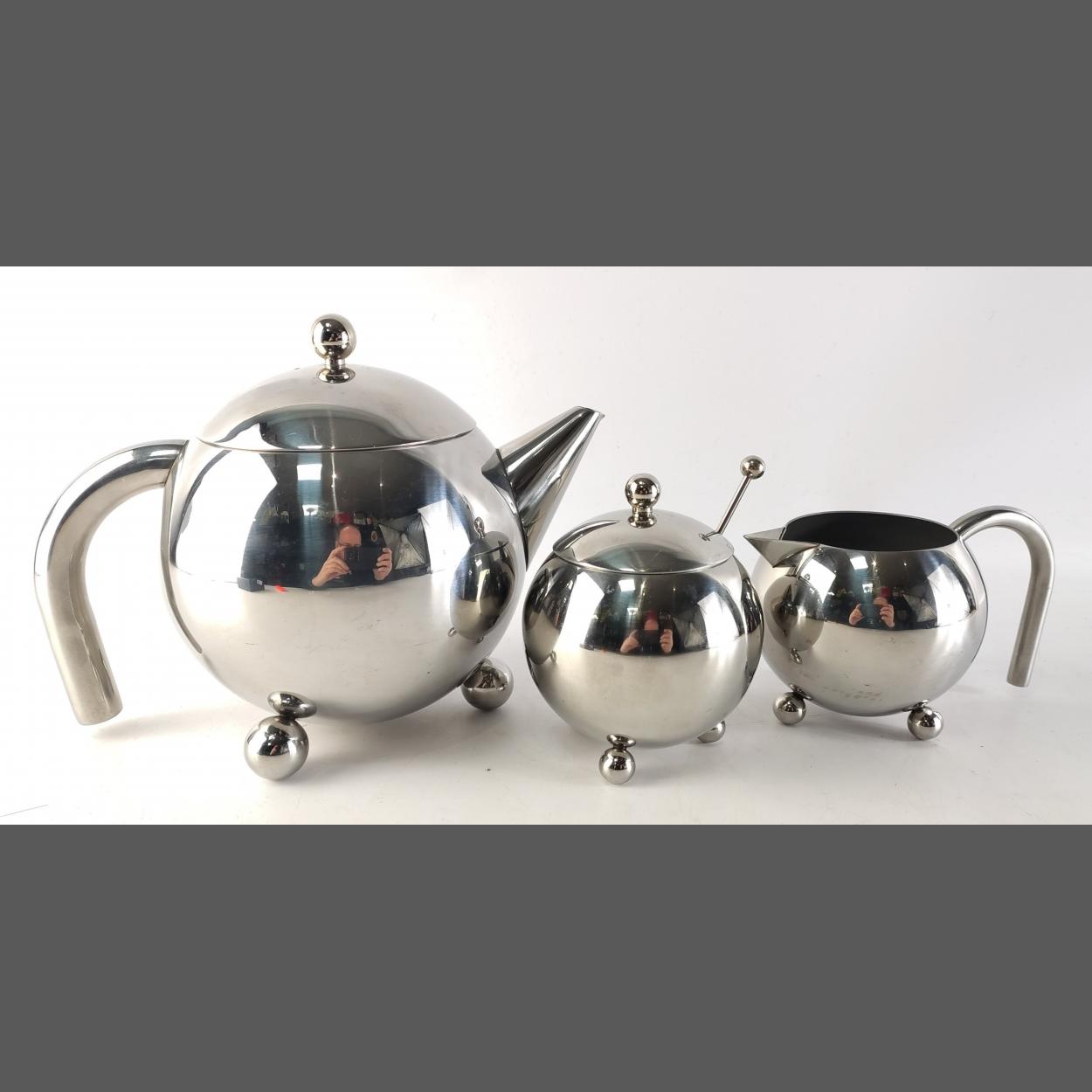 A very appealling ART DECO style stainless steel tea service comprising tea pot, cream and sugar bowl with spoon. Very stylish but useable as well.