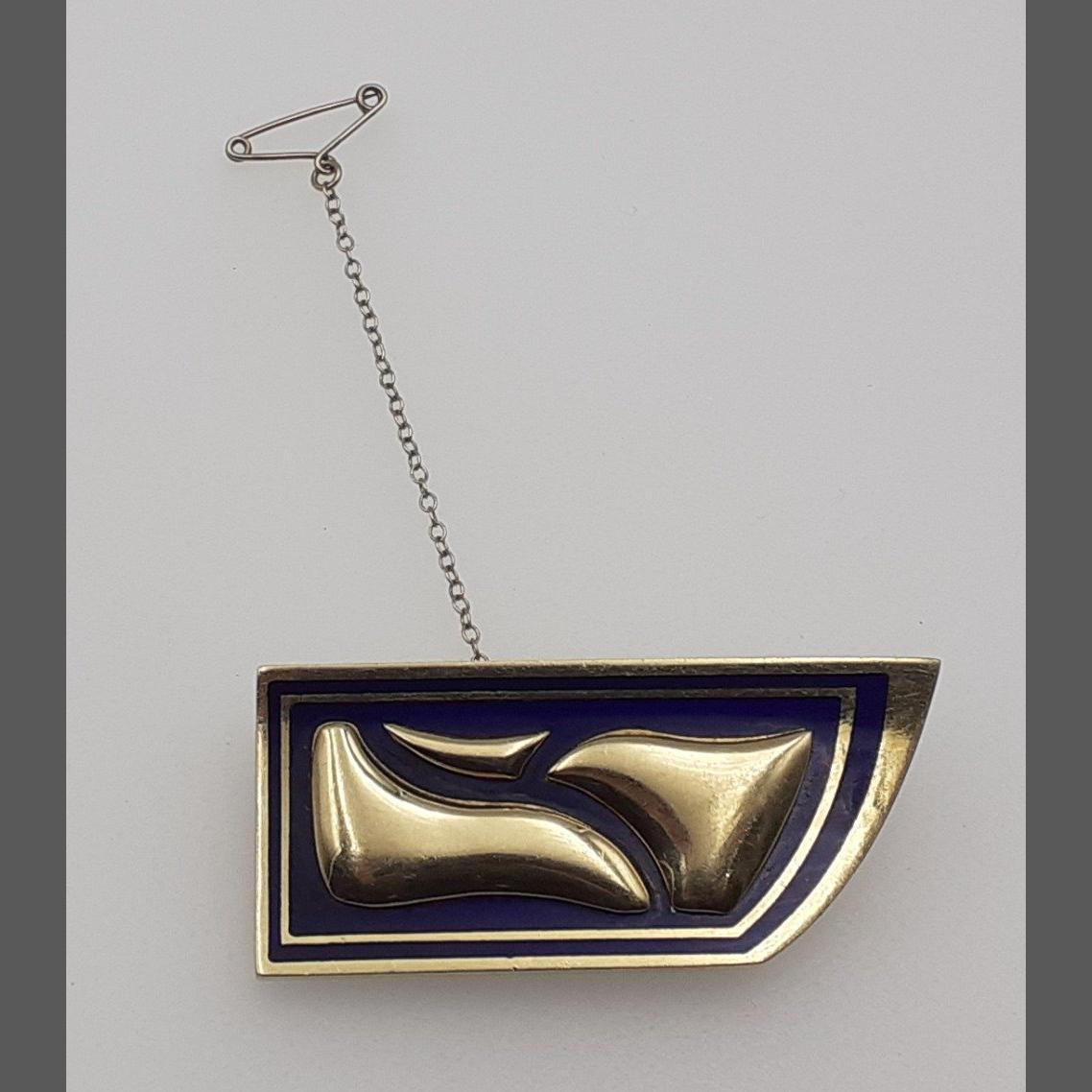 Unusual angular brooch with blue enamel design. Artisan made. HAS INDISTINCT MARKS.