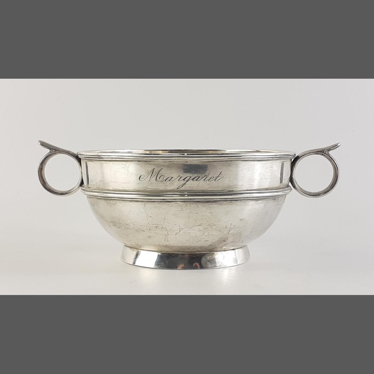 A fully hallmarked sterling silver two handled quaich style bowl. Mappin & Webb Ltd Sheffield 1926. 12cm approx, Weight 237g approx.