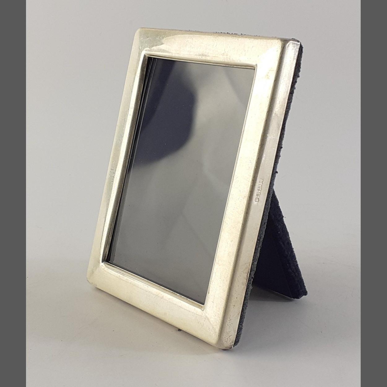A silver hallmarked small photo frame with stand. Hallmarks for Sheffield 1988, Maker FM - Franklin Mint