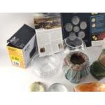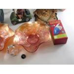A mixed lot to include 2 carnival bowls (20cm dia.), 2 glass dishes, a leather bound vase, paperweights, Bush radio etc.