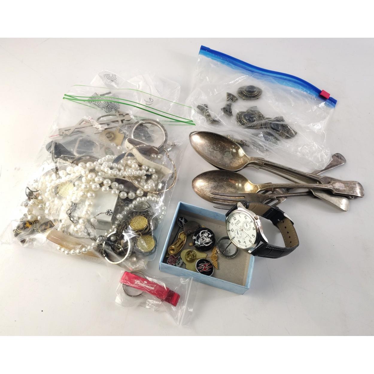 A mixed lot to include silver plated cutlery, costume jewellery as found, pin badges etc.