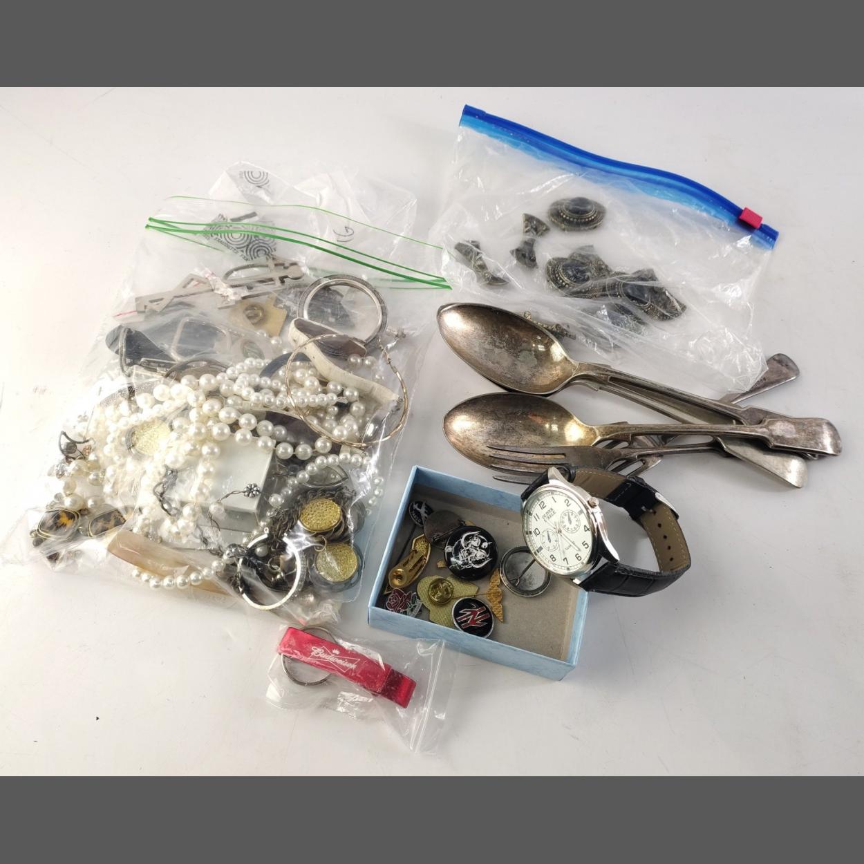 A mixed lot to include silver plated cutlery, costume jewellery as found, pin badges etc.