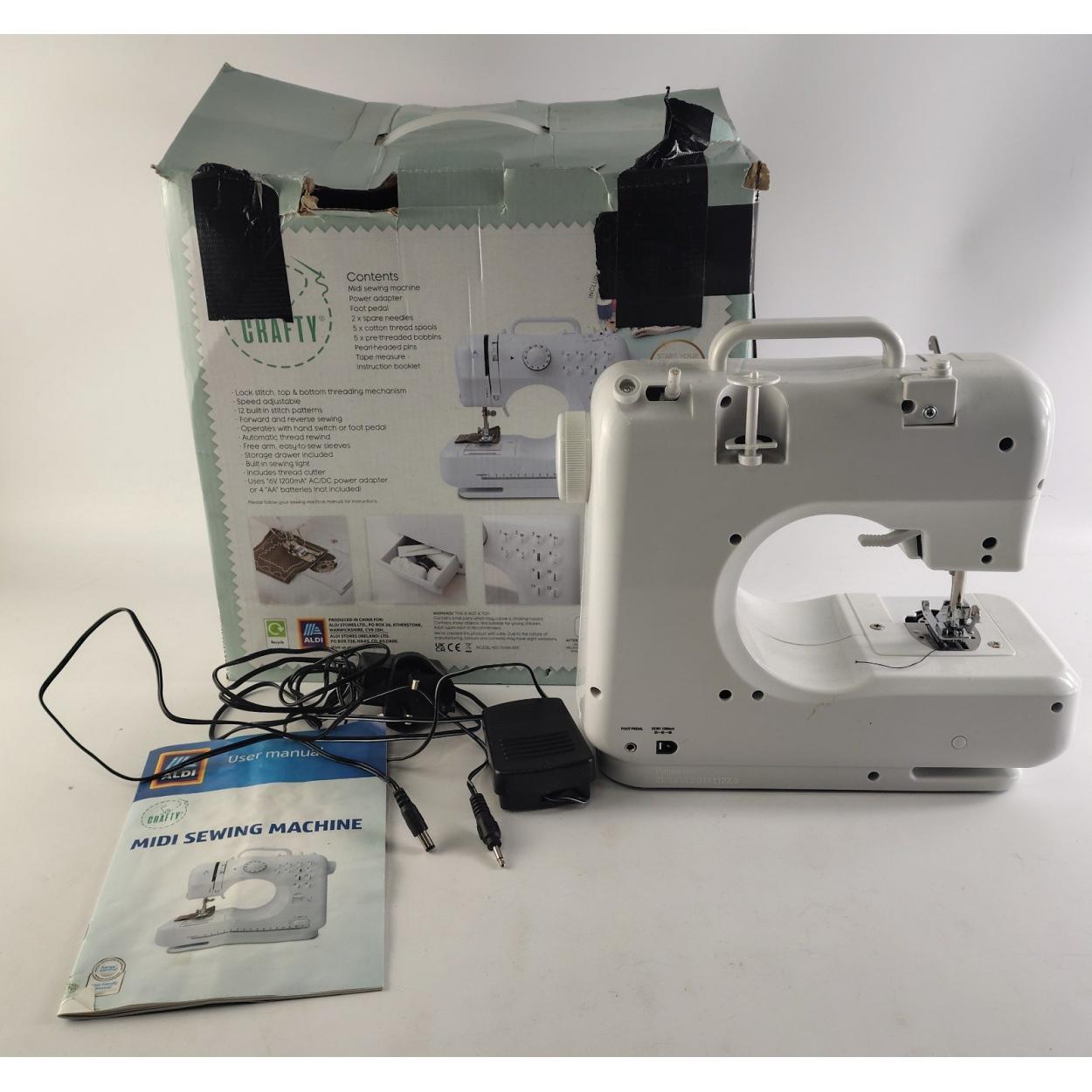 A boxed ALDI midi sewing machine with foot pedal and cable. In original box