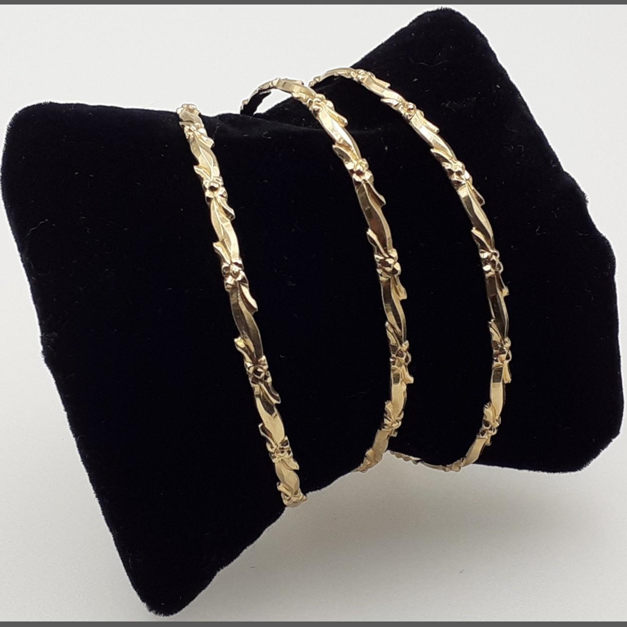 Three unmarked yellow metal bangles. Total gross weight 23g approx. Jeweller tested as 18ct.