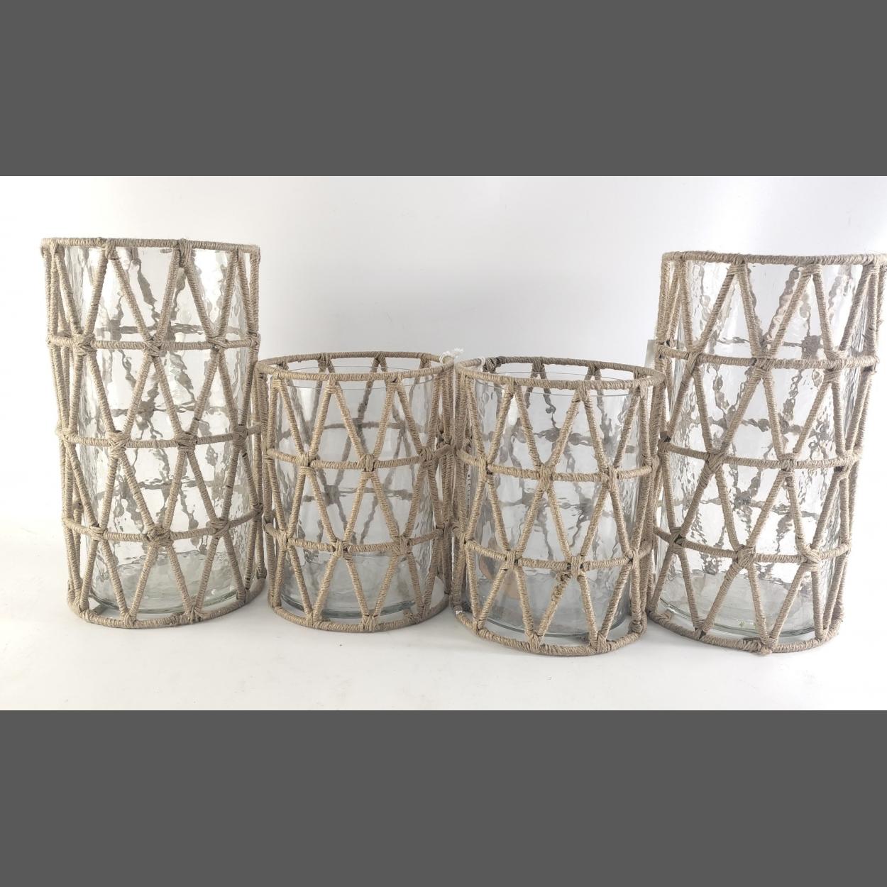 XMAS GIFTING IDEAS ! - Four attractive glass candle holders with wire covered jute feature, tallest stands 26cm approx. RRP over £100.