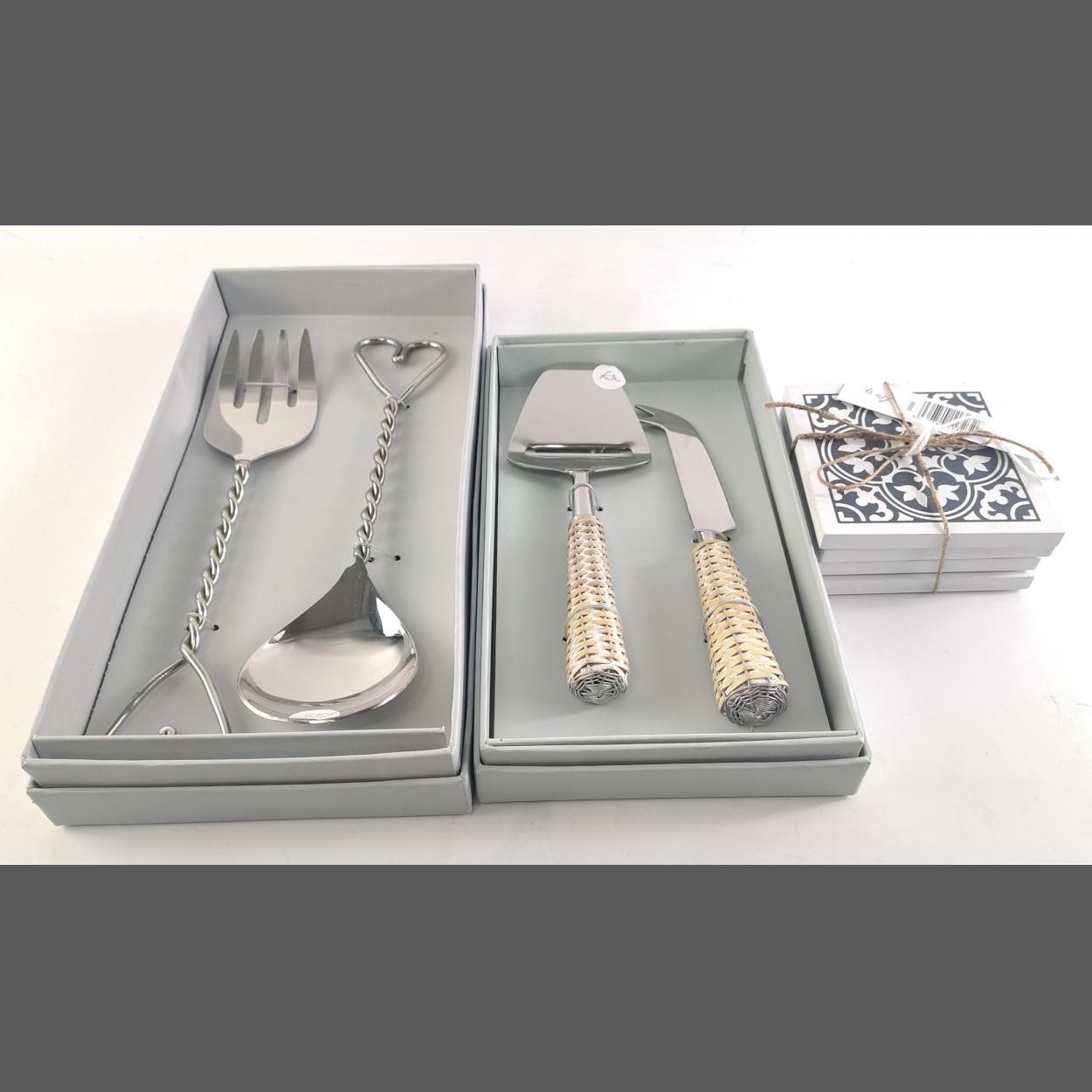 XMAS GIFTING IDEAS! A set of four brand new black and coasters with also a cheese slicer and knife and a pair of salad servers. RRP over £70.
