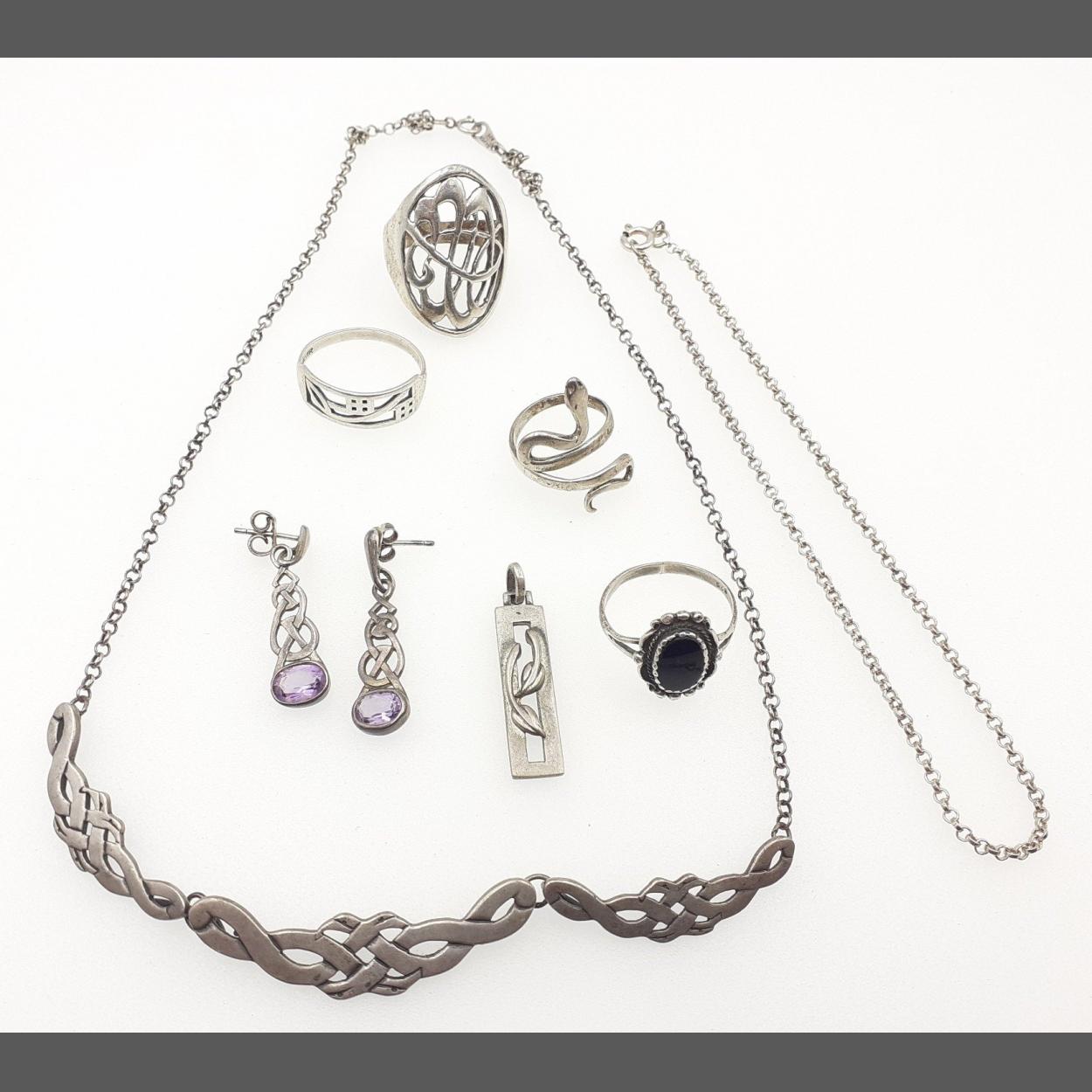 A small SILVER JEWELLERY lot to include rings, Rennie Mackintosh pendant, chains etc. Total gross weight 26g approx.