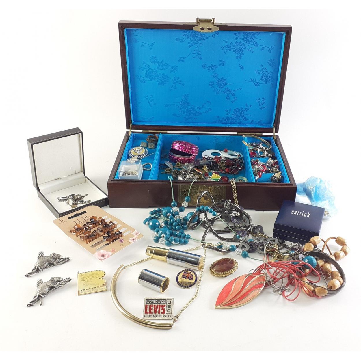 Interesting Oriental style jewellery box stuffed with beads, buttons, bangles etc. A great rummage lot of some lovely pieces. Cute fieldmouse brooches, much of interest.