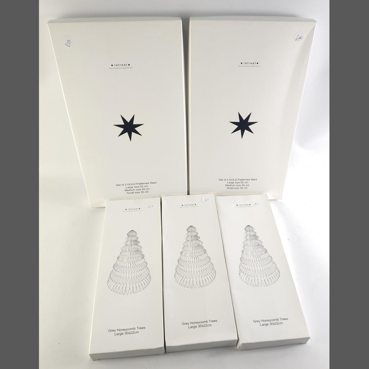 XMAS GIFTING IDEAS! Boxed Christmas decorations to include 2 sets of gold patterned stars (65, 45 and 35cm) and 3 large grey honeycomb trees (30 x 22cm). RRP over £70
