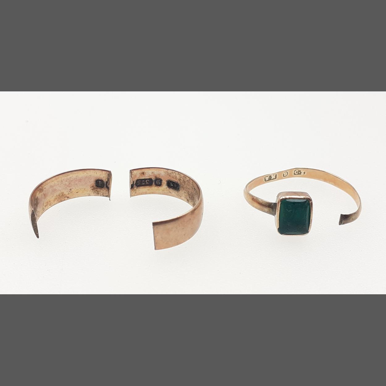 Two 9ct marked broken rings, one with small green stone. Gross weight 4g approx