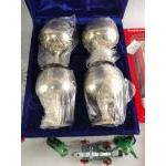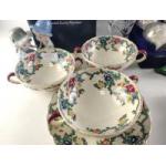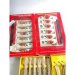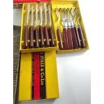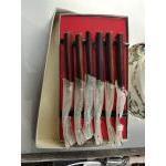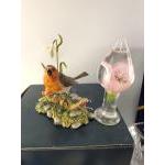 A mixed box to include a crystal vase (13cm high), 3 ROYAL CAULDON Victoria soup bowls with saucers, BORDER FINE ARTS robin signed by AYRES, 2 boxes of wooden handled knives and forks plus a set of serving cutlery. Also a boxed set of goblets and boxed porcelain place card holders.