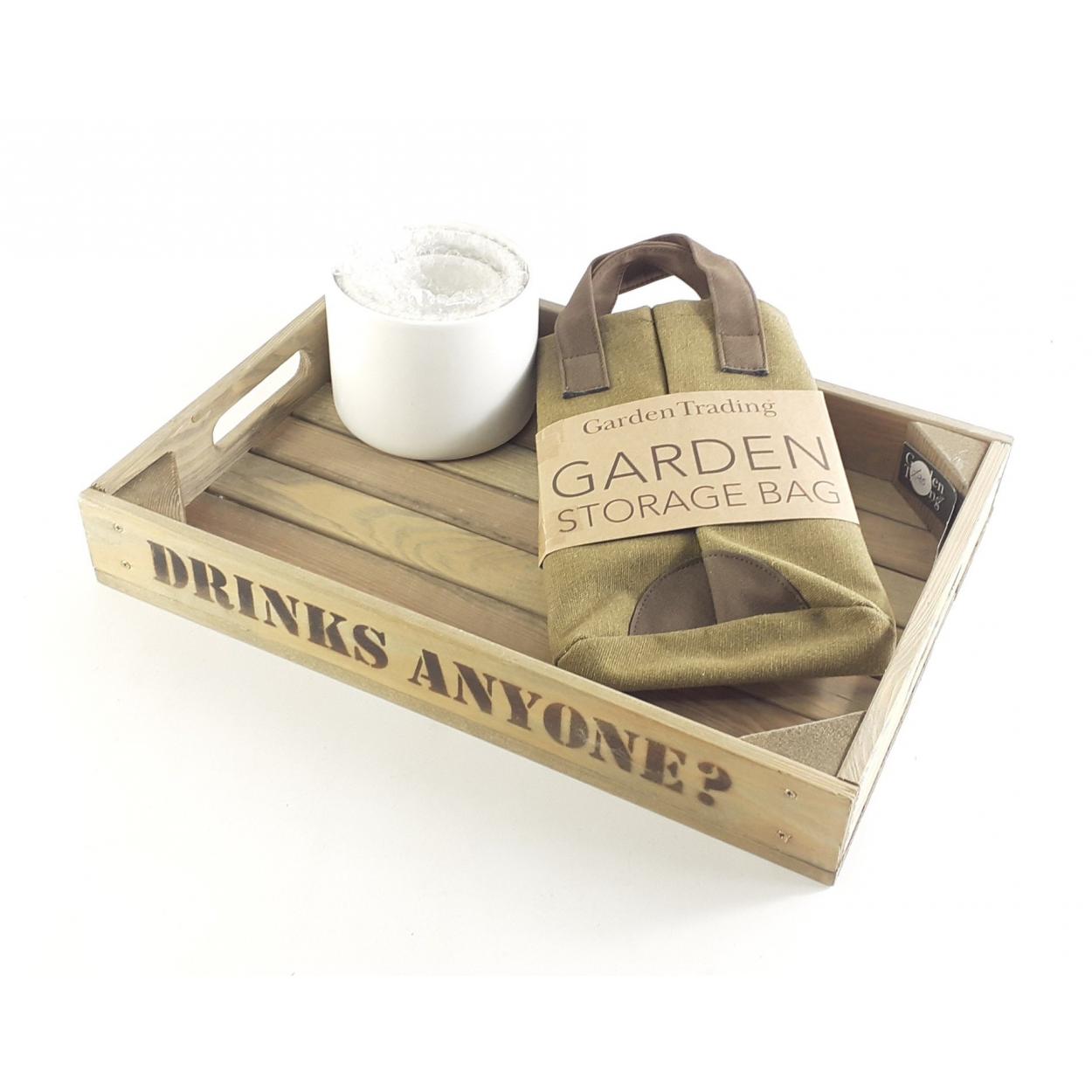Plan now for the summer with a GARDEN TRADING garden storage bag, 3 small white ceramic planters and a 'Drinks Anyone' tray 40 x 28cm