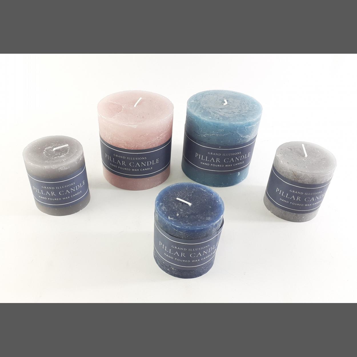 A collection of five GRAND ILLUSIONS pillar candles to include dusky pink, petrol blue, 100 x 100mm plus three smaller ones (70 x 75cm) in light grey and inky blue