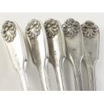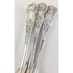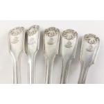 A lovely set of five large silver plated armorial spoons, each 23cm long, some with Dutch tulip mark and three smaller similar pattern dessert spoons. Super quality.