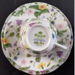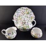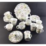 QUEENS Fine Bone China tea service. COUNTRY MEADOW pattern. Comprising teapot, sugar & cream, 6 cups & saucers, five side plates, four mugs and a sandwich plate.