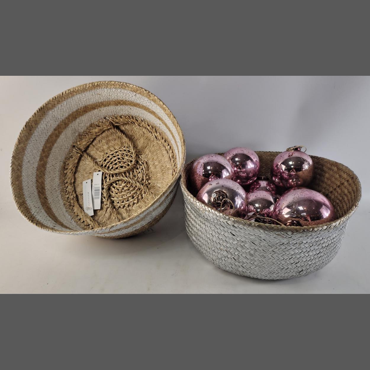 XMAS GIFTING IDEAS! Two woven baskets filled with 12 large pink Etched Snowflake Christmas baubles.