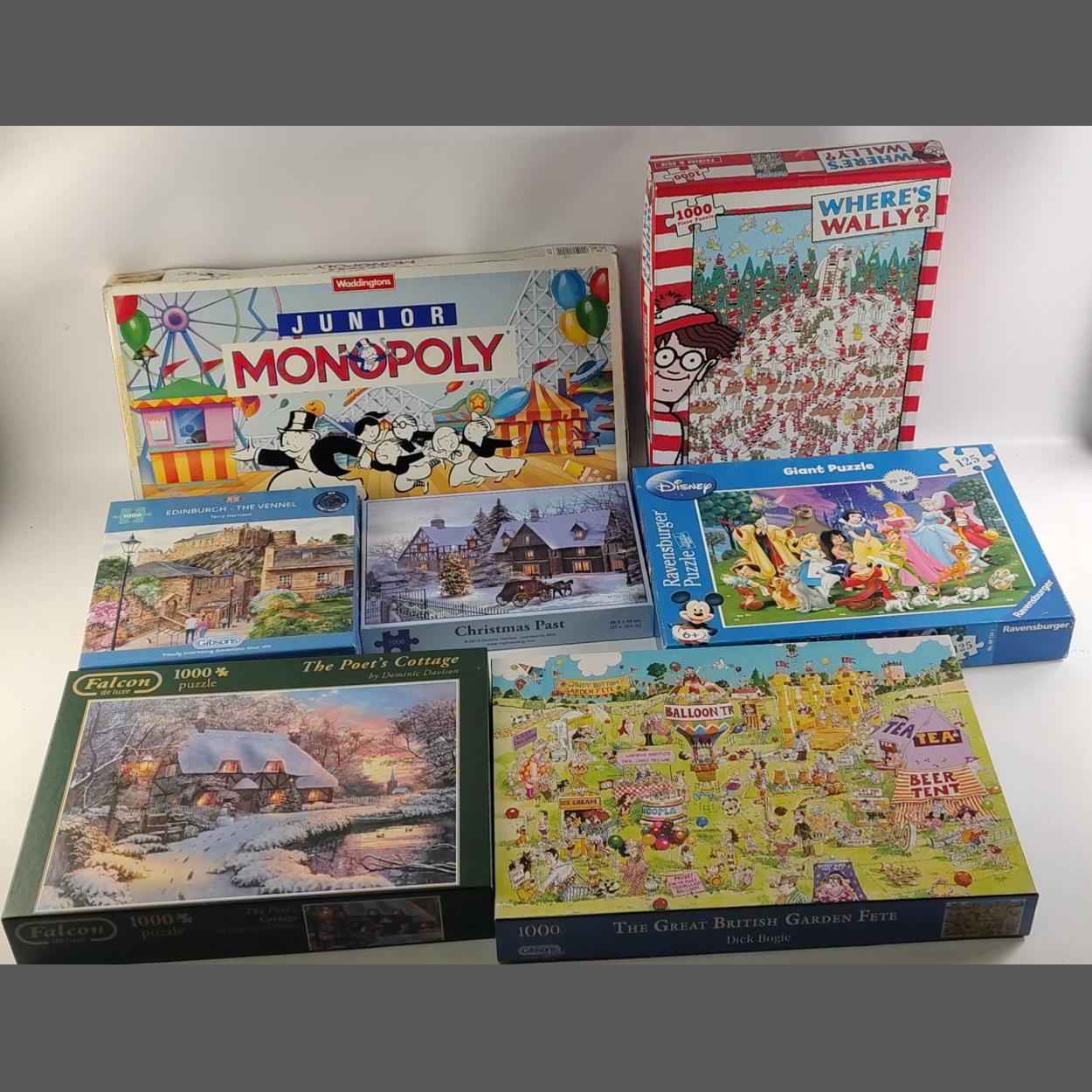 At home entertainment including 6 jigsaws- Where's Wally?, Disney (125 pieces), Edinburgh: The Vennel, Christmas Past, The Poet's Cottage. Each 1000 pieces. Also a boxed Junior Monopoly