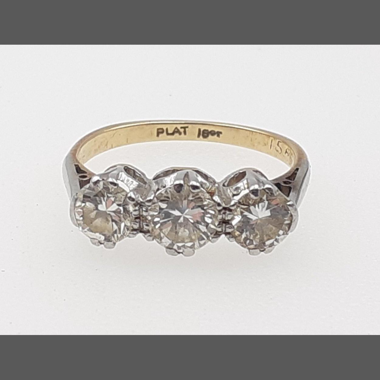 An 18k stamped platinum three diamond ring, set with three beautiful large clear stones. The centre diamond measures 4mm approx. Jeweller measured at just over 1.5ct in total of good old cut stones. The stones are free from chips etc. Size M, gross weight 3.3g approx