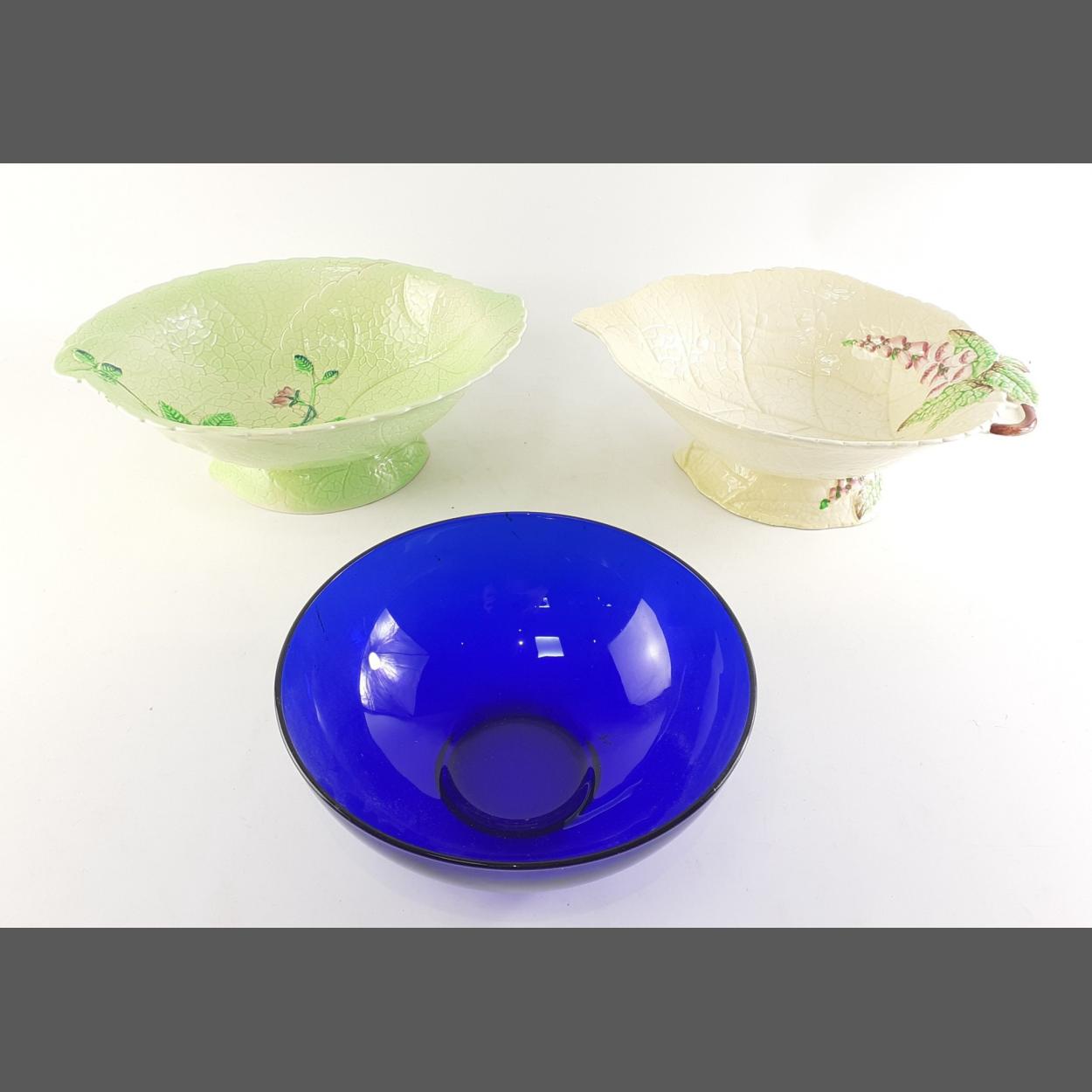 Two CARLTON WARE footed bowls both made in England each 29 x 22cm approx with also a blue glass bowl (20cm approx)