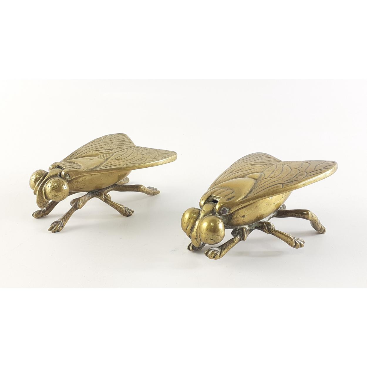 A pair of vintage brass fly ashtray ornaments. Each 10cm long and in good working order.
