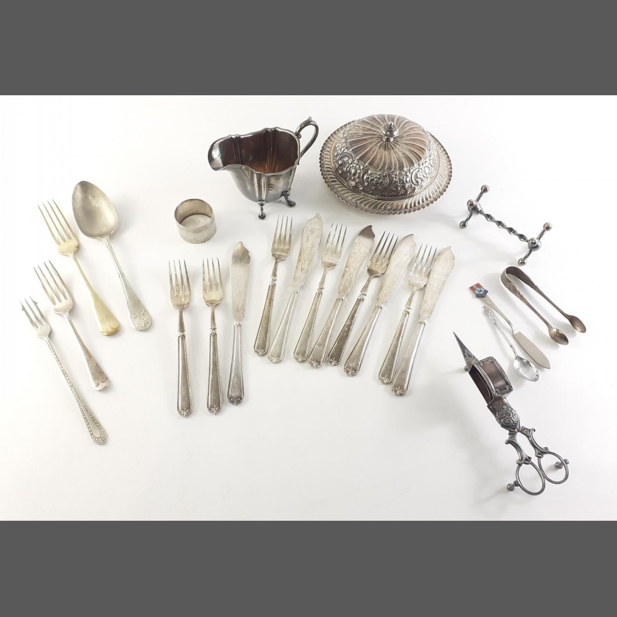 A super lot of silver plated items to include lidded bonbon dish, jug, fish knives and forks, napkin ring and others. A good lot of quality items.