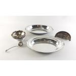 A classy silver plated lidded serving dish 28cm, a bowl and a sifter spoon and a very attractive highlt decorated letter rack with cherries motif. Three lovely pieces.