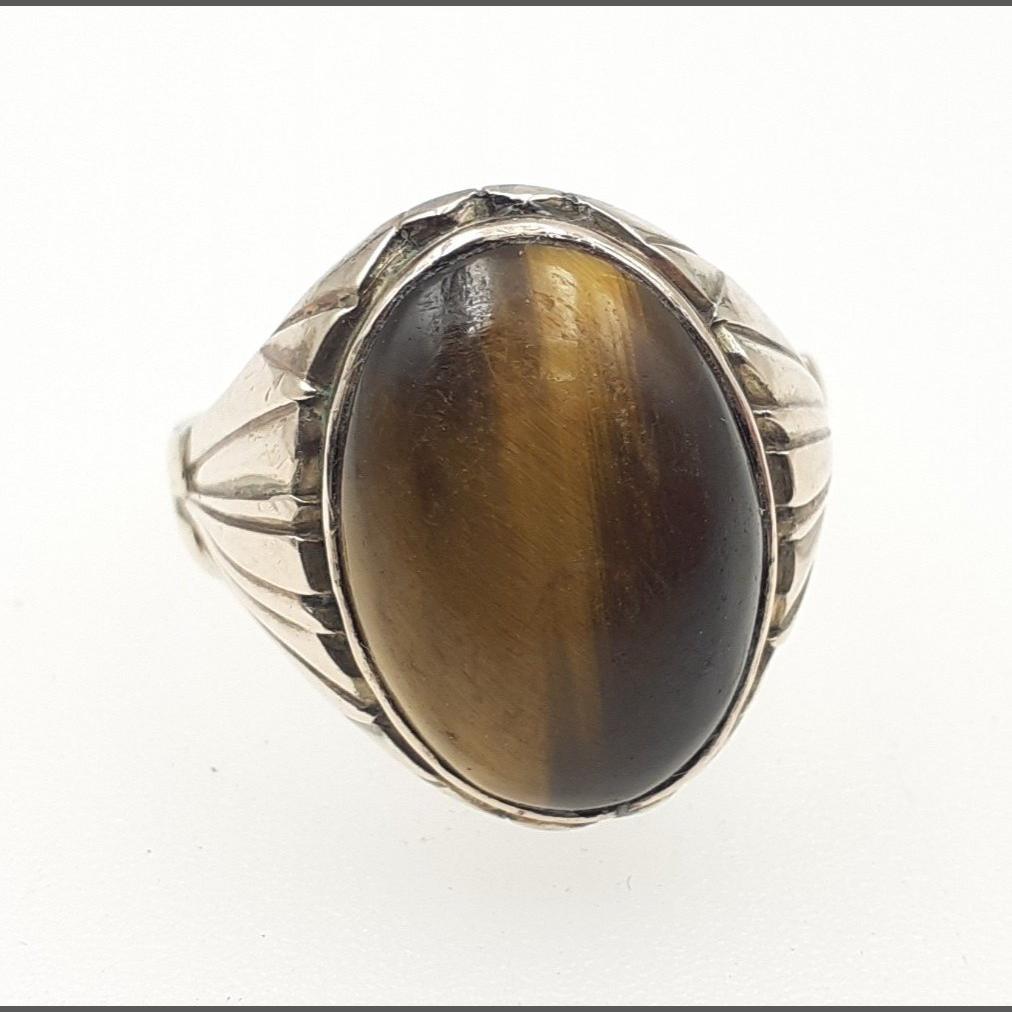 UMMM A stunning unmarked yellow metal ring with TIGER EYE centre. Size X gross weight 6.3g approx.