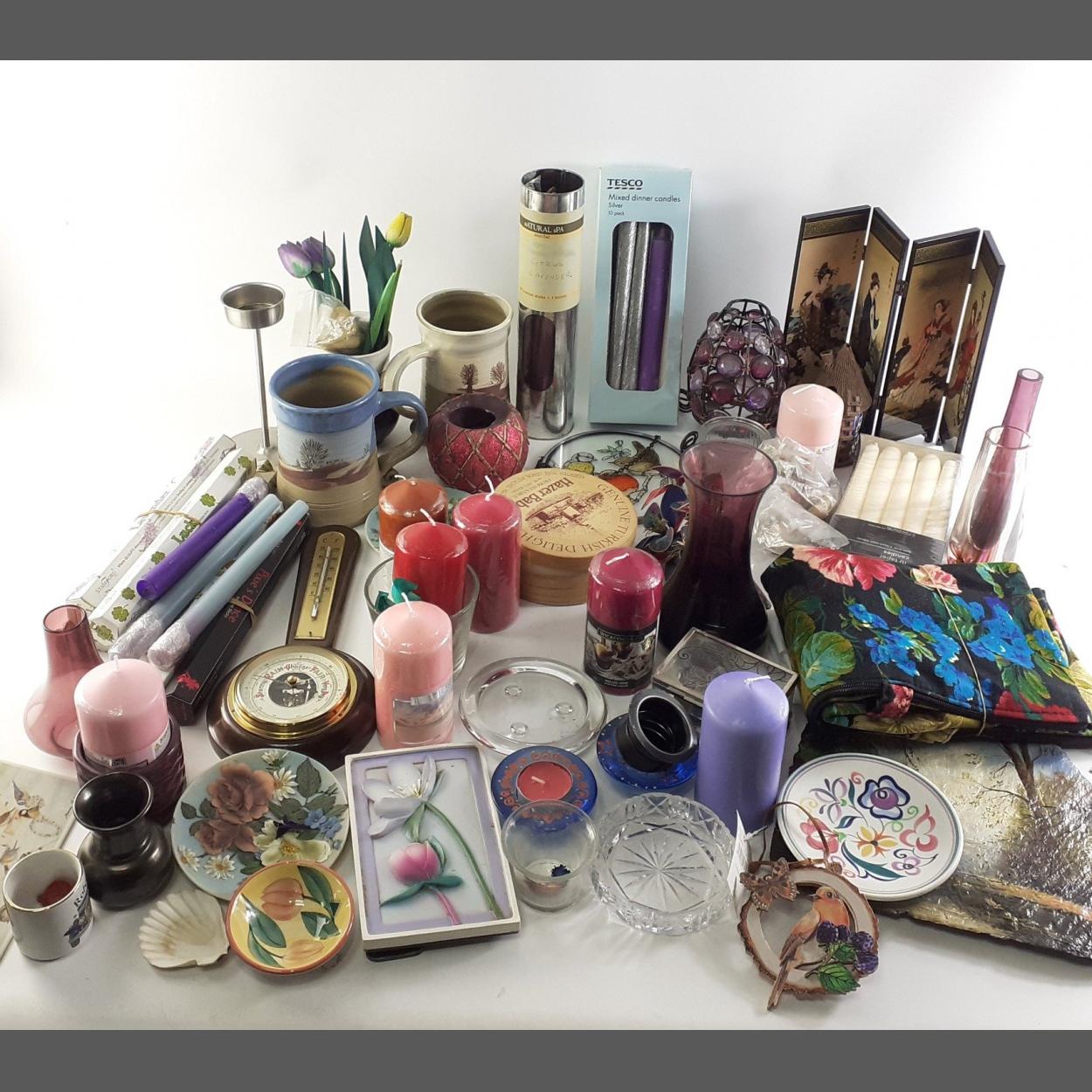 A collection of decorative items and many candles, polished stones, incense sticks and much else.