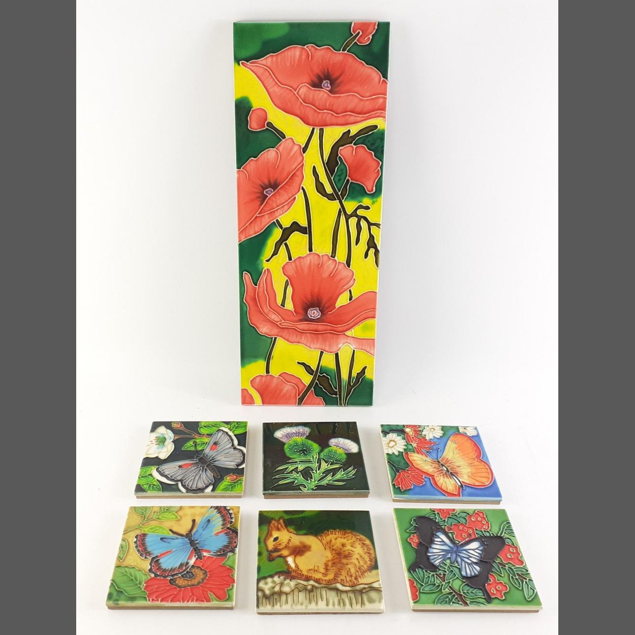 Colourful six standard floral tiles and a larger oblong tile. All in good clean condition.