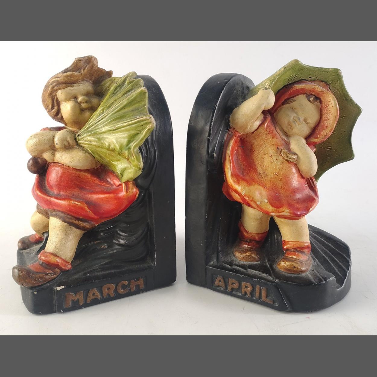 Vintage set of Bretby 'Mabel Lucie Atwell' ceramic bookends with young girl with umbrella in strong wind. One marked March, other marked April. Base marked 'BRETBY MADE IN ENGLAND 3234'. Some minor damage noted. H: 13cm approx