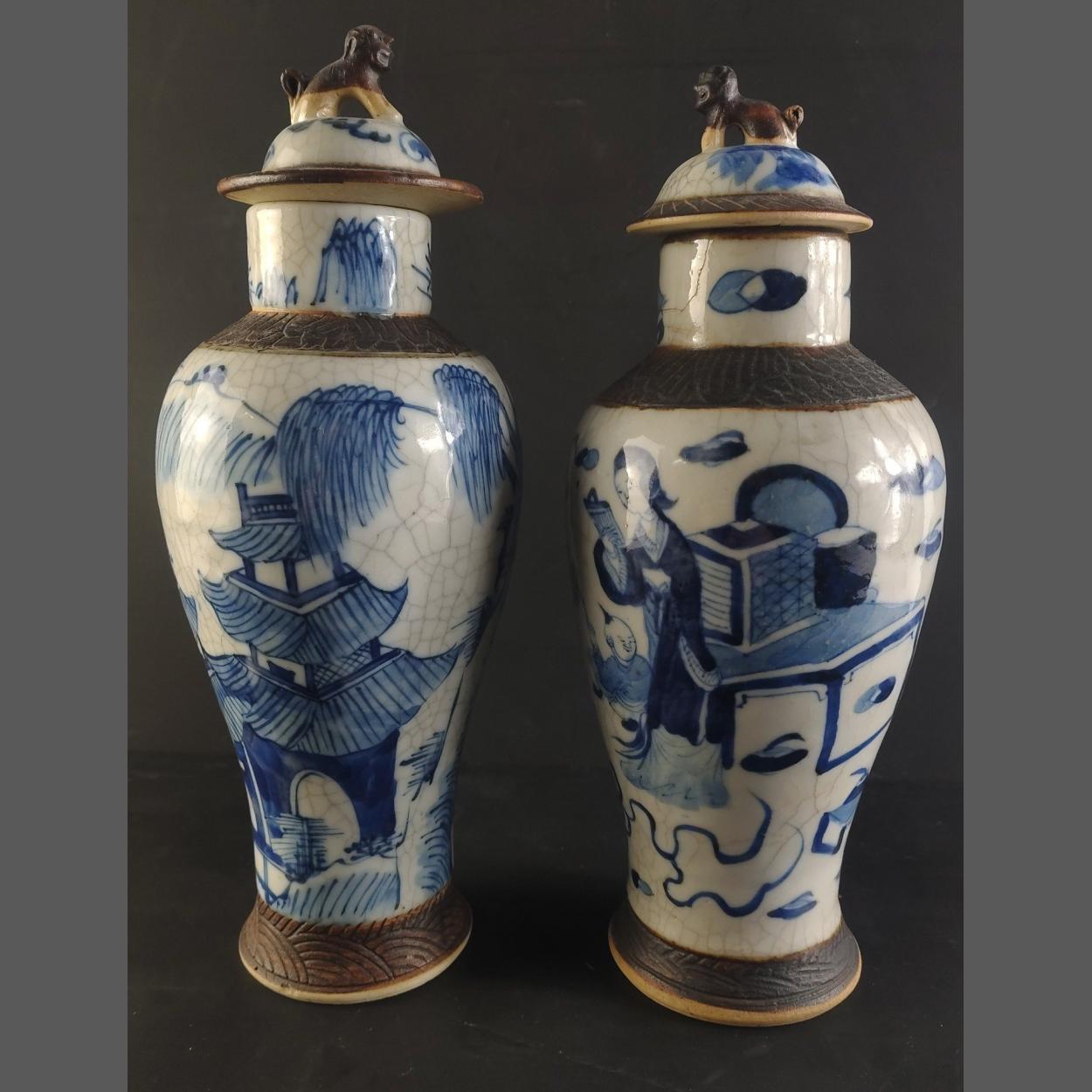 A pair of antique lidded oriental jars with foo dog finials. Each 28cm tall approx. With light cracks.
