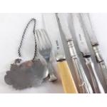 A selection of part sterling silver items to include knives with silver handles, knife with silver blade, a Sherry decanter label etc. Total gross weight 140g approx