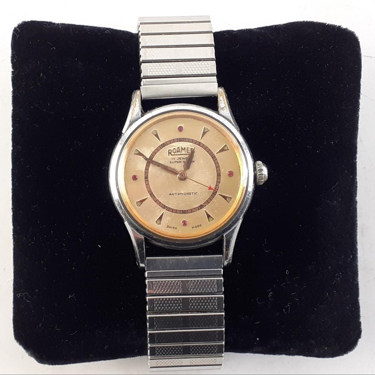 A vintage gents ROAMER 17 Jewels Swiss manual watch on expanding steel band. Red arrow point second hand. A good quality watch, running well at valuation.